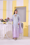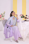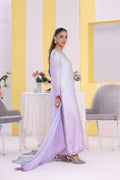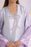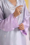 A fluid silk ensemble in soft lilac tones, adorned with delicate hand-embroidered motifs and subtle beadwork. The neckline features refined handcrafted detailing, while fine embellishments scattered across the shirt and scalloped edges add a graceful, contemporary finish.